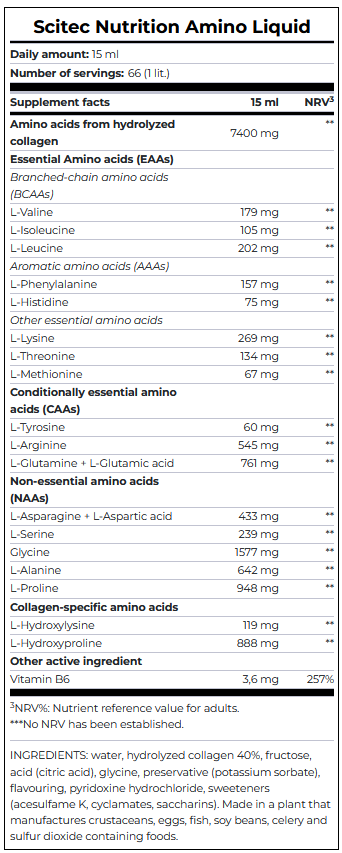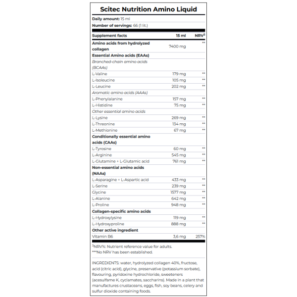 AMINO LIQUID is a fast and more convenient way of amino acid intake.The fat-free and saturated fat-free formula is fortified with Vitamin B6, which contributes to normal protein and glycogen metabolism, to the reduction of tiredness and fatigue, and to the regulation of hormonal activity*.